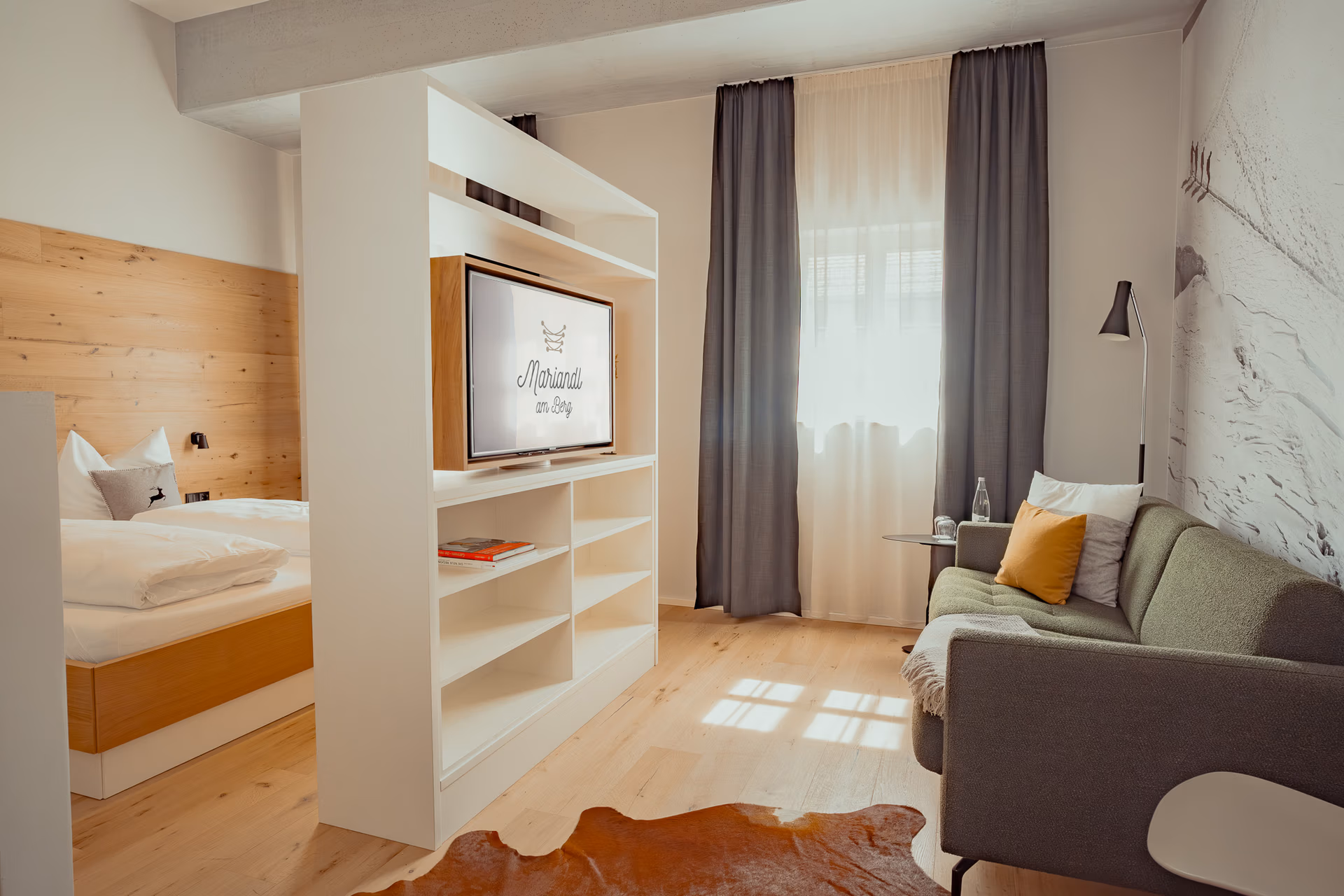 In unserer BergHüttn L habt Ihr nicht nur zu zweit mehr Platz – Ihr könnt Euch auch noch zwei weitere Gäste einladen, die ganz bequem auf unserer Schlafcouch nächtigen können. Kombiniert mit dem modernen Bad, der ebenerdigen Regendusche und dem separaten WC fehlt es Euch an nichts! Kommt vorbei und genießt die Zeit – zu zweit, dritt oder viert.